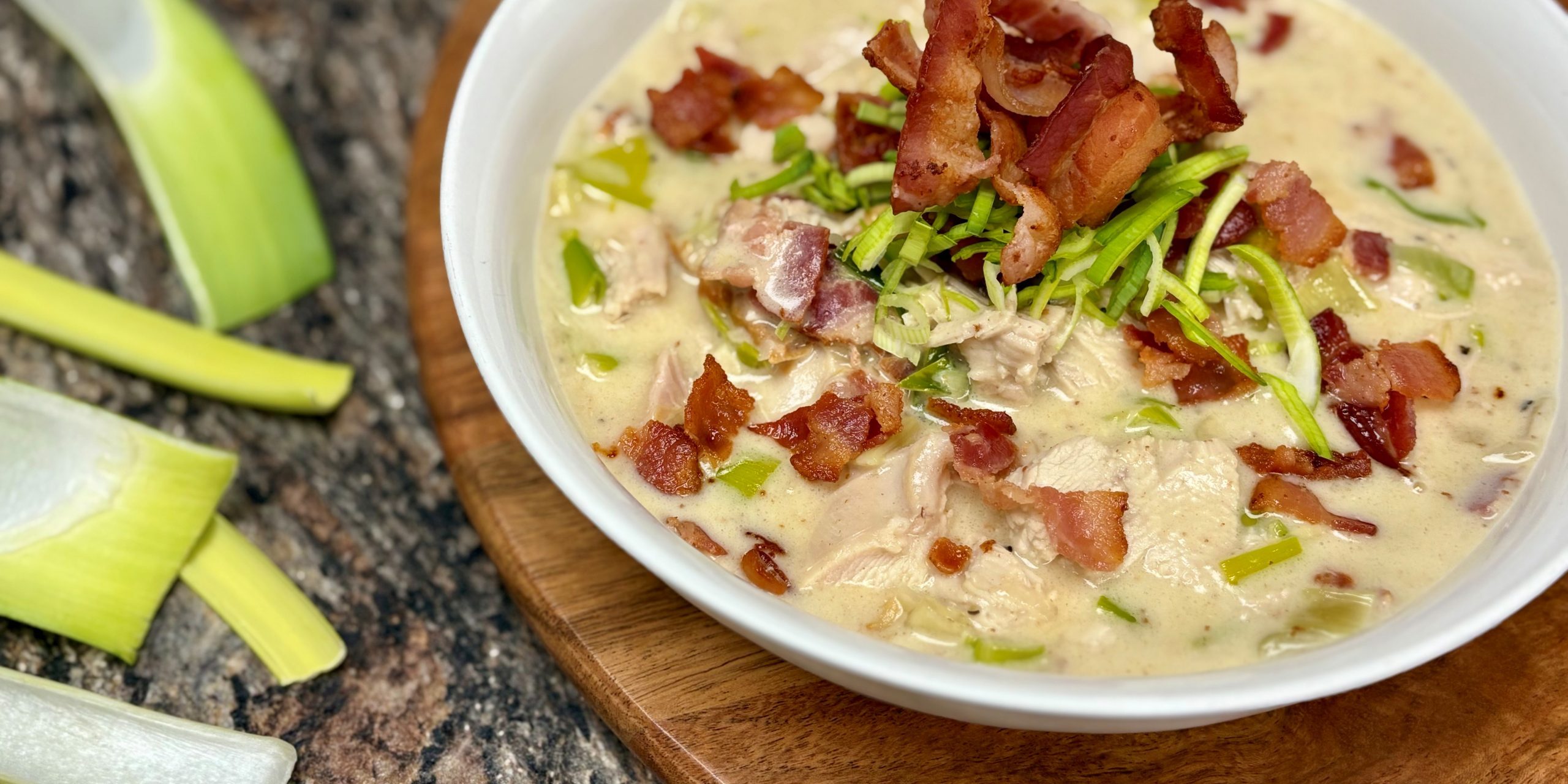In a large heavy bottomed pot, brown the bacon until crispy. Remove the bacon and drain on a paper towel but keep the grease in the pot. Cut the leeks lengthwise and then cut into thin half rounds. Discard the top of the leaves and the stem. Sautee the leeks and shallots in the bacon fat for about 5 minutes adding salt and pepper to taste. Drain the leeks and shallots and remove excess bacon fat from the pot. Add in the butter to the pot and stir in the flour. Whisk to combine and cook on low for 5 minutes. Add cold chicken stock and whisk until smooth. Bring to a simmer and add in the leeks, shallots, turkey and most of the bacon. Simmer for 10 minutes and remove from the heat and add in the heavy cream. Top with remaining bacon and serve!